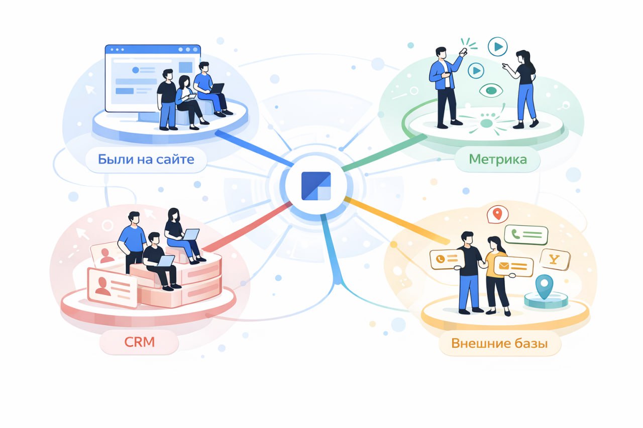 По сути это стыковка источников: Метрика, CRM, выборки из k-client. На их пересечении как раз и появляются осмысленные аудитории для Директа.